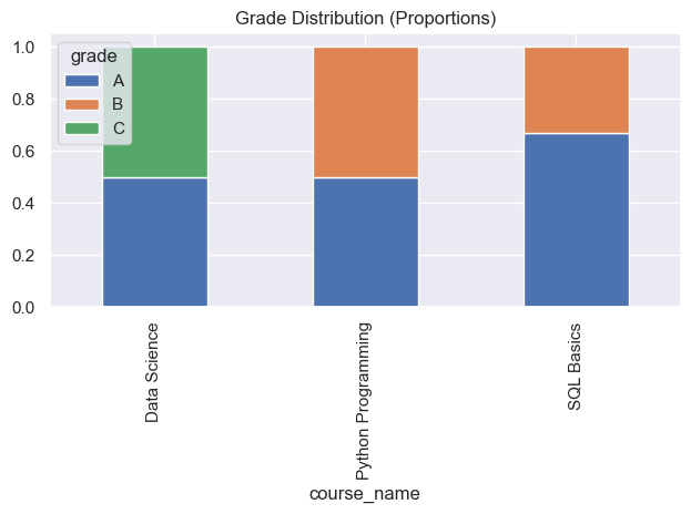 prop.plot(kind="bar", stacked=True, title="Grade Distribution (Proportions)")